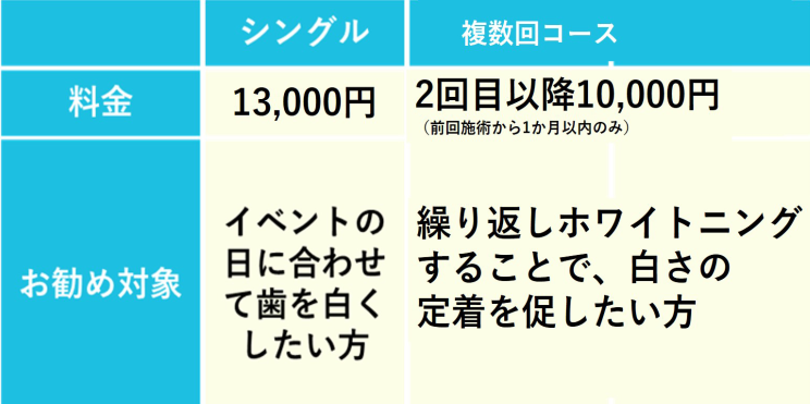 複数回コースはホワイトニング実施の間隔が30日以内の場合に限りご利用可能です。ご予約ではありませんのでご注意下さい。